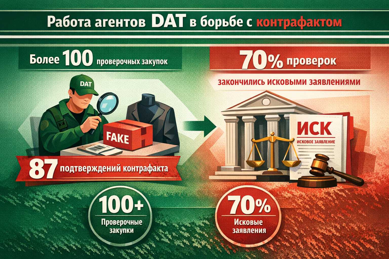 DAT усилил контроль рынка в 2025 году и делится результатами работы. Проверочные закупки, юридические действия и сопровождение дел до стадии исполнения — это цепочка, которая показывает реальную эффективность защиты бренда от контрафакта. В течение года команда фиксировала нарушения, переводила их в правовую плоскость и добивалась практического результата — не только на бумаге, но и на этапе исполнения решений.
